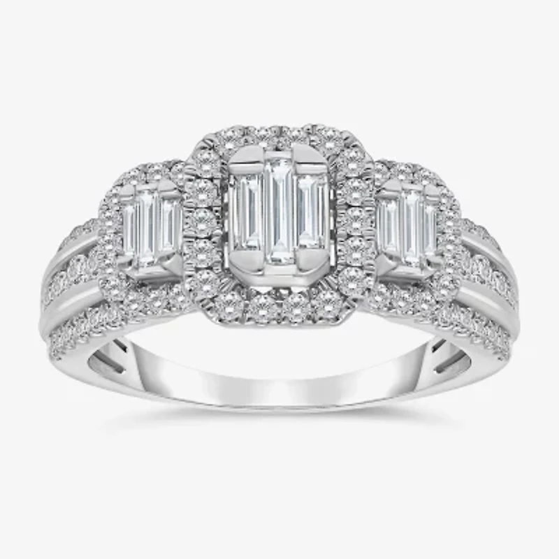 This elegant women's engagement ring from the Love Lives Forever collection features a captivating three-stone design, with stunning baguette-cut Lab-Grown Diamonds at its center each surrounded by a halo of sparkling round-cut stones. Crafted from 10K White Gold, the band is adorned with three rows of round-cut stones that flow along the sides, bringing the total carat weight to 1 carat.