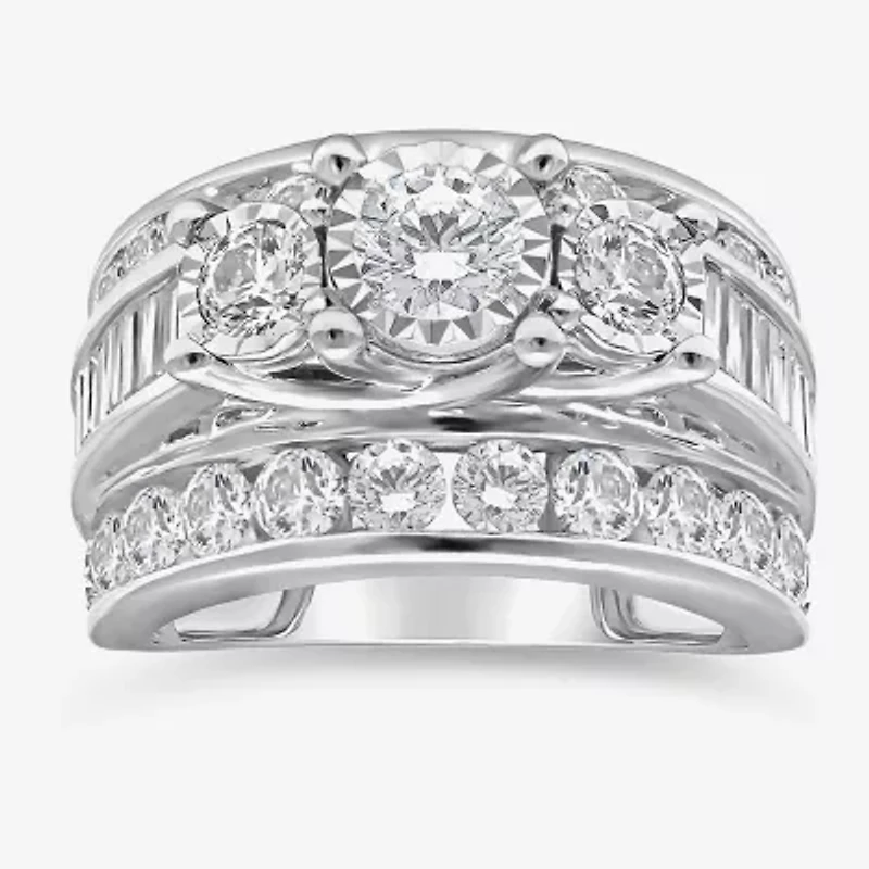 This women's engagement ring from the Modern Bride collection is an ornate sparkling showstopper that will turn heads. Crafted from 10K White Gold, it features 4 carats of Lab-Grown Diamonds in total in varying round and baguette cut varieties in the three-band design.