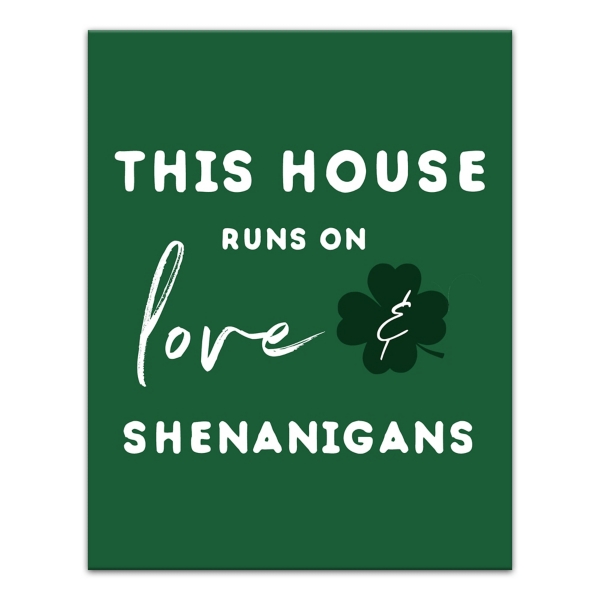 Add a festive touch to your walls with our Love & Shenanigans Canvas Art Print! Featuring green hues and a four-leaf clover, this canvas will make your St. Patrick's Day décor pop anywhere in your home! Print measures 11L x 1.25W x 14H in. Digitally printed on genuine artist canvas Reads, "This house runs on love & shenanigans" Hues of green and white Weight: 0.87 lbs. Designed and printed in the USA Care: Wipe with a soft, dry cloth. This item is available at Kirklands.com only, not available in stores. Please note: this item cannot be shipped to APO/FPO addresses.