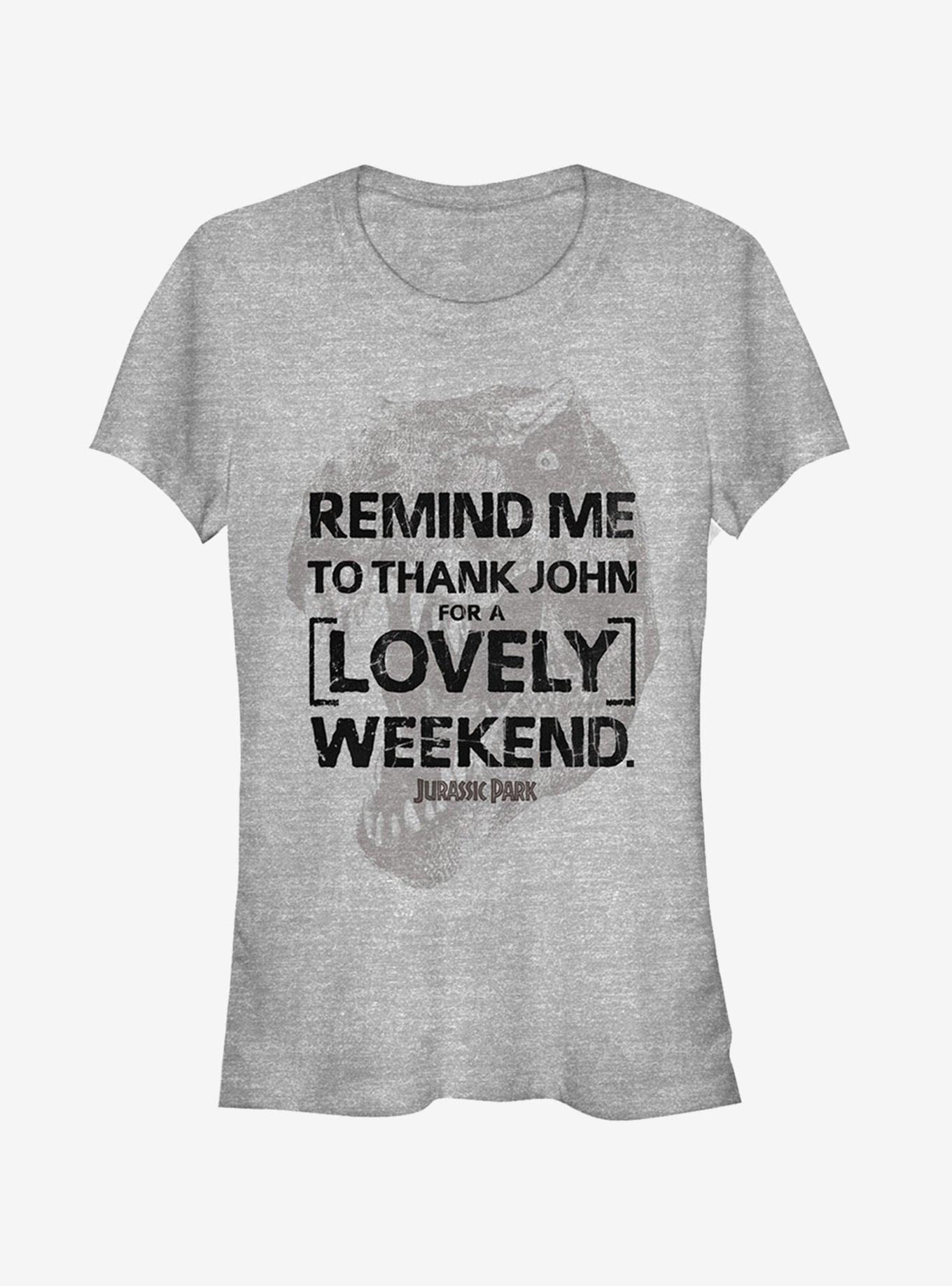 You may not make it out of Jurassic Park in one piece, but at least you got the awesome Jurassic Park Lovely Weekend T-Shirt for your visit! Dress sharp (did someone say something about sharp teeth!?) with an awesome dinosaur shirt inspired by your favorite T. Rex movie.