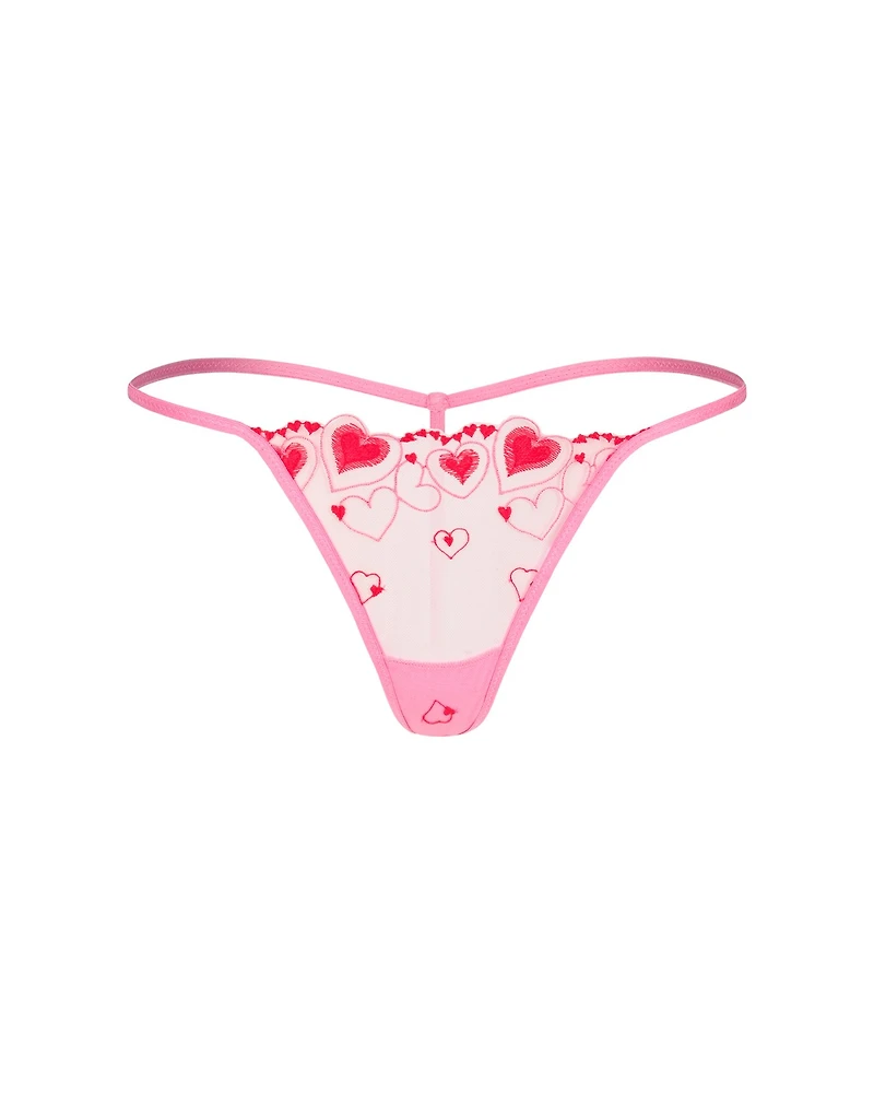 The Lovette G-String Medium Pink embroidery G-string is a playful and flirty piece for your top drawer. Effortlessly charming, it features a pull-on design, Sheer, lightweight fabric, Full waistband elastic, and regular rise. (Available in sizes XS-XL.)