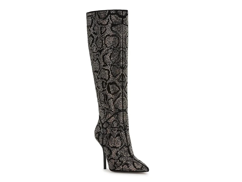 Make a stunning entry in the Jessica Simpson Lovienn boot. Unique patterned stud accents give a whimsical look to the tall, pointed-toe boot, elegantly lifted by a sleek tapered heel. The partial zipper on the inside offers convenient wearing.