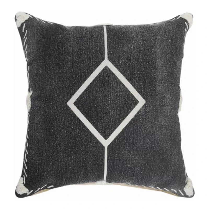 Designed to thrill, our pillow collection will add intricate mastery and eye-pleasing designs to any room. This particular addition dwells perfectly on a comfy couch, bed, or bench. The white tufting and border provide stark contrast of texture between the solid black background. The classic coloring allows these pillows to standalone or be easily added to a collection. Prop yourself up in style or just use for delightful interior design. Flat woven in India, these pillows are made to last and are soft to the touch.