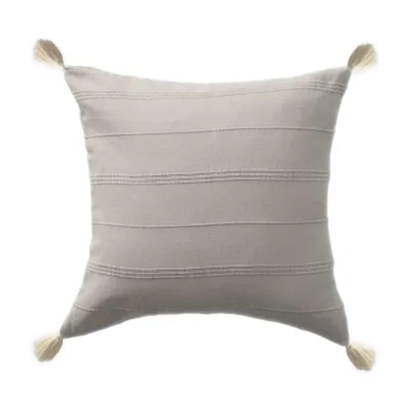 Refresh your home, apartment, or dorm with this 18" x 18" modern farmhouse throw pillow, expertly power-loomed from premium Turkish cotton. Featuring decorative tassels and a plush polyfill insert, this stylish accent pillow is perfect for layering on sofas, accent chairs, and beds, adding comfort and a pop of color to any living space.
