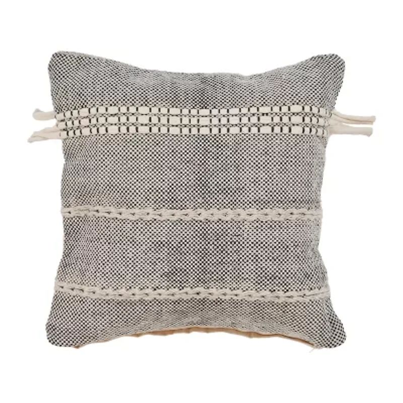 Add a boho touch to your home, apartment, or dorm with this 20" x 20" hand-woven throw pillow. Made from soft cotton in a stylish black and beige color palette with textured details, this pillow includes a polyfill insert for comfort and support. Perfect for layering on sofas, accent chairs, and beds, it effortlessly enhances any living space with its eclectic design and artisanal appeal.