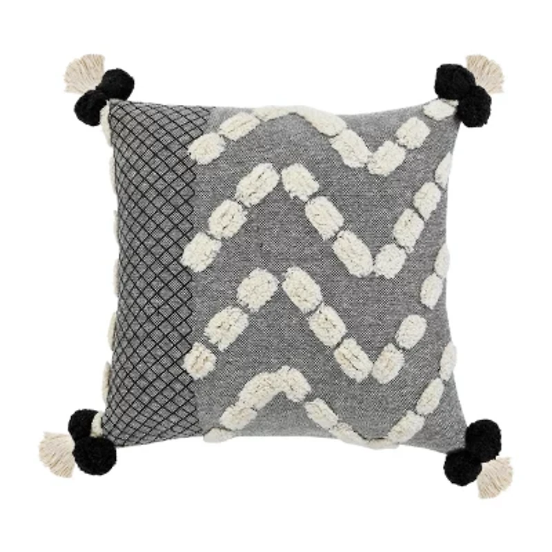Replenish your soul in nostalgic joy with our Lr Home Zara Textured Square Throw Pillow! Handcrafted with the customer in mind, there is no compromise of comfort and style with the pillow line we create. This collection offers soft, plush textures with playful bohemian vibes. This addition features dark-hued cross-stitching, funky zigzag over tufting and corner pom-poms tassels. Place this accent in a bedroom, kid's area, or entryway for eye-catching style and endless compliments.