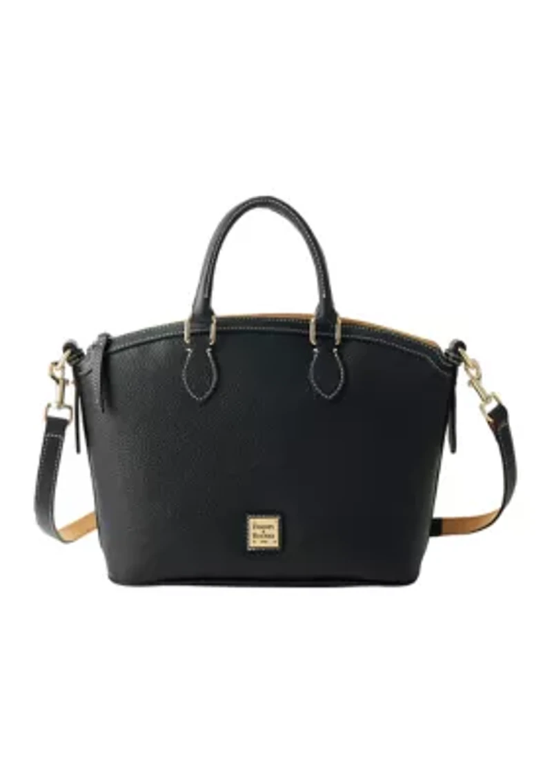 This classic silhouette satchel bag from Dooney & Bourke is crafted from pebble grain leather and jewelry-grade hardware. Take it with you anywhere you go! Handle drop: 4.5"; Strap drop: 23" Removable strap Exterior: one outside zip pocket, feet Interior: one inside zip pocket, two inside pockets Lined Imported Product Specifications 9.75" L x 5.75" W x 9" H Material & Care Leather Clean with a soft cloth