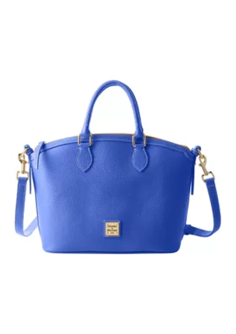 This classic silhouette satchel bag from Dooney & Bourke is crafted from pebble grain leather and jewelry-grade hardware. Take it with you anywhere you go! Handle drop: 4.5"; Strap drop: 23" Removable strap Exterior: one outside zip pocket, feet Interior: one inside zip pocket, two inside pockets Lined Imported Product Specifications 9.75" L x 5.75" W x 9" H Material & Care Leather Clean with a soft cloth