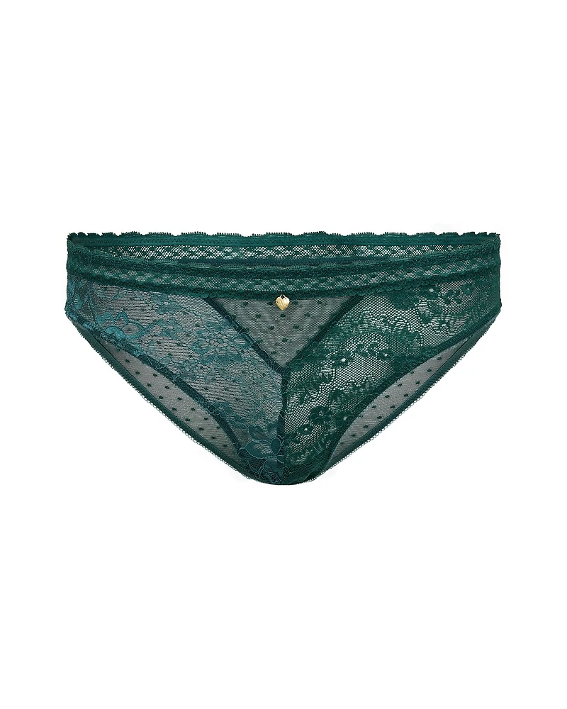 The Lucie Bikini Dark Green lace bikini is a tailored essential with a flirty edge. This style features a pull-on design, lightweight fabric, Slightly sheer, regular rise, and Full waistband elastic. (Available in sizes XS-XL.)