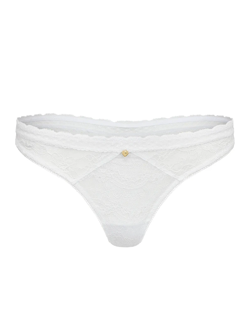 The Lucie Thong White lace thong is a tailored-essentials staple with a flirty twist. It features a pull-on design, lightweight fabric, regular rise, and Full waistband elastic. (Available in sizes XS-XL.)