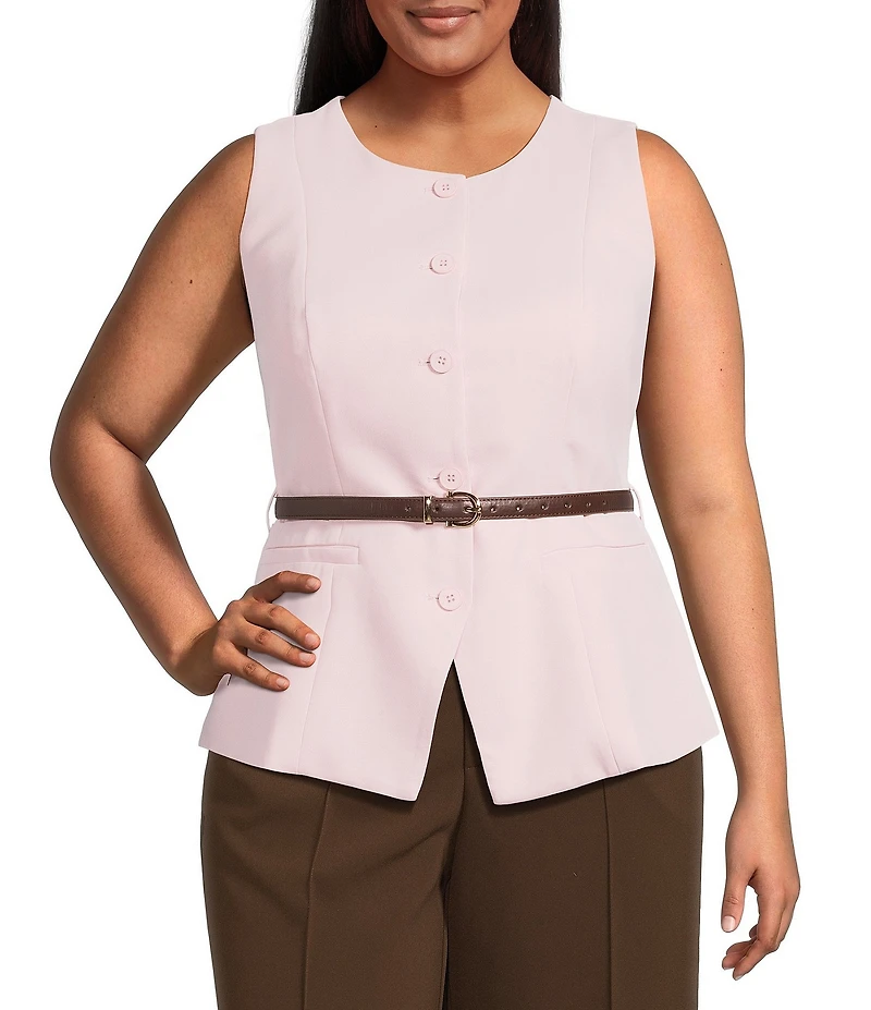 From Lucy Paris Plus, this vest features: Round neckline Sleeveless Button front closure Belted detail Shell of polyester; lining of polyester/spandex Machine wash/tumble dry Imported.