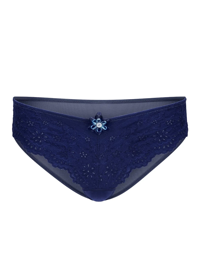 The Lumi Cheeky Dark Blue lace cheeky is a romantic-fashion statement piece. Effortlessly chic, it features regular rise, Mesh inset, and lightweight fabric. (Available in sizes XS-XL.)