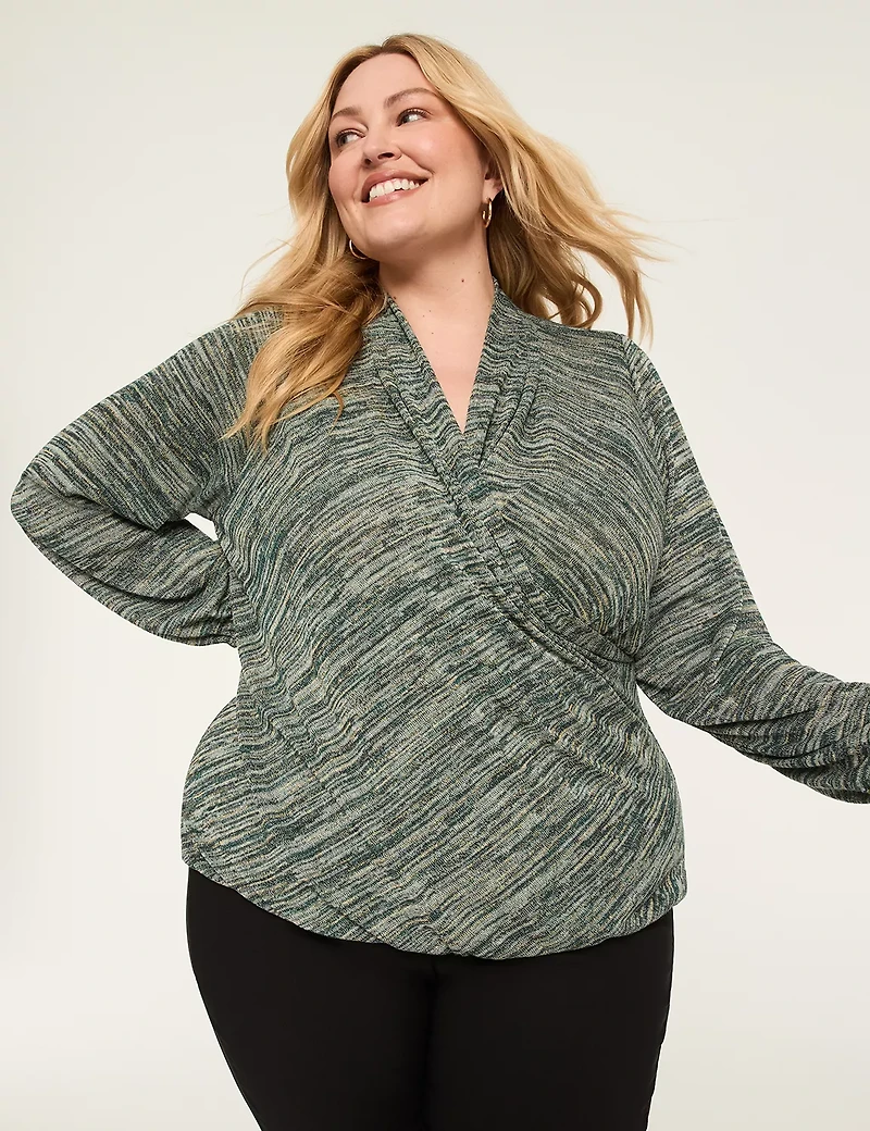 Available in Plus Size Perfect for both a *staying in* or going out kind of date, this comfy-chic top comes in special, sparkle knit with statement sleeves and an always-flattering faux-wrap neckline. FIT: Classic. Designed for curves and a not-too-tight, not-too-loose, just-right fit. Front Length (On Body): 28.5" Standard length FEATURES: Surplice faux-wrap neck Long blouson sleeves with covered elastic cuffs SPECIAL DETAIL: Shimmery Lurex detailing FABRIC: Soft, stretchy knit with shimmery Lurex TURN INSIDE OUT, MACHINE WASH COLD WITH LIKE COLORS,GENTLE CYCLE, ONLY NON-CHLORINE BLEACH WHEN NEEDED, TUMBLE DRY LOW,COOL IRON IF NEEDED. 96% POLYESTER 2% SPANDEX 2% OTHER FIBER Item Number #413574 Imported Plus Size Top ". Plus Size Lurex Blouson-Sleeve Faux-Wrap Bubble-Hem Top, in Black, 26/28, Women's, Lane Bryant