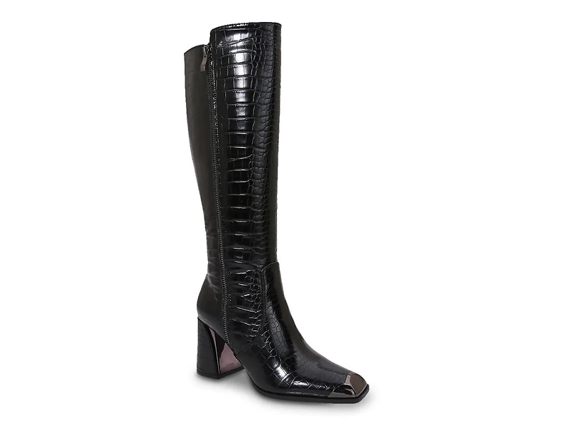 The Lux boot from Ninety Union amps up all your cool weather looks with its croc-printed upper, chunky block heel, and metallic square toe. This knee high features a decorative outside zipper for added style and a lightly padded footbed for support.