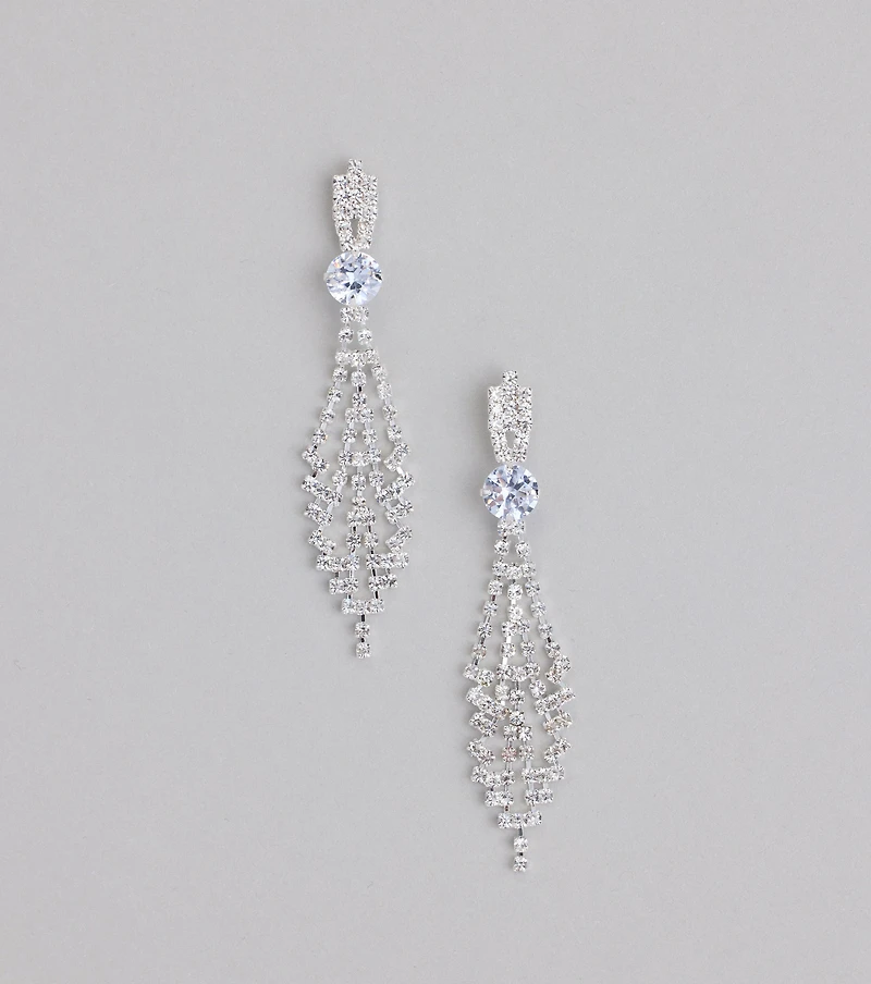 Add that luxe shimmer to your cocktail party looks with these rhinestone earrings featuring a long chic chandelier design.