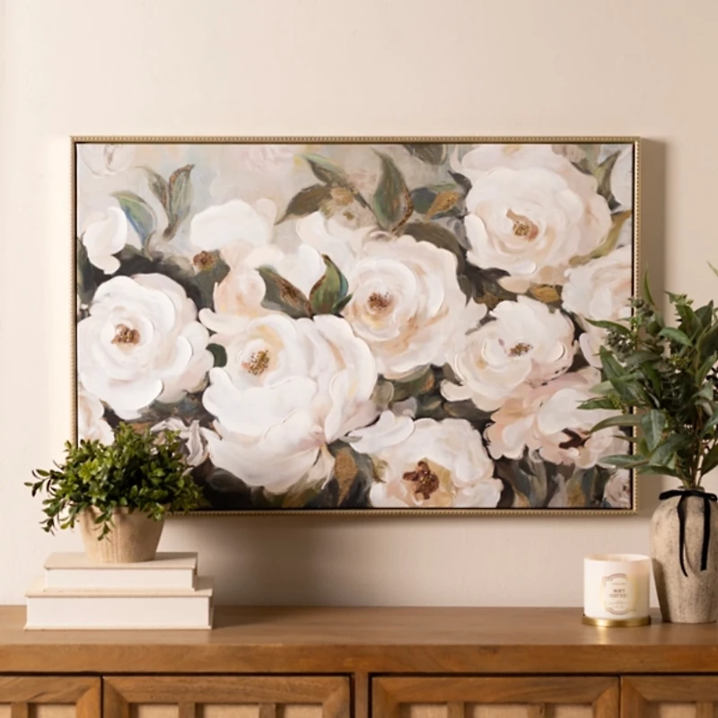 Fill your walls with the romantic charm of this Luxe White Roses Framed Canvas Art Print. The golden details pop beautifully among the soft, white blooms! Overall dimensions Width: 36 in. Depth: 1.38 in. Height: 24 in. Distinctively printed on stretched canvas Gold frame around wrapped canvas Floral subject Hues of white and green Gold foil accents Hangs from back-mounted hardware Care: Dust with a soft, dry cloth. Contact your local Kirkland's store for availability. Quantities and selection may vary by location. WARNING: Cancer and Reproductive Harm - For more information go to www.P65Warnings.ca.gov .