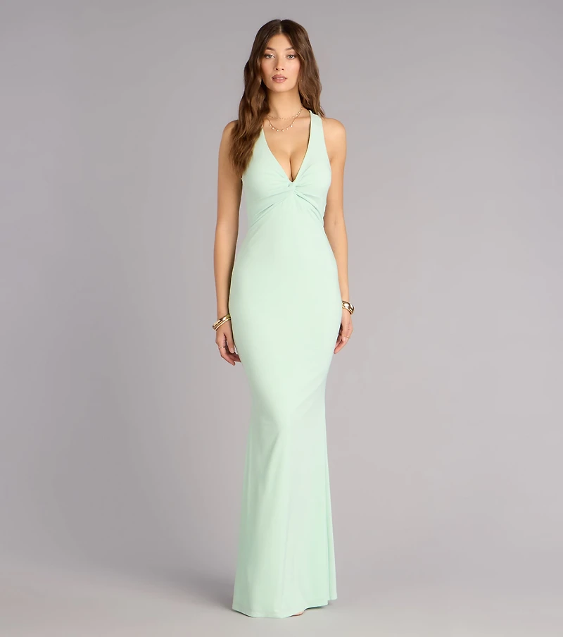 Special Occasion Striking yet effortlessly refined, this knit gown is designed for entrances that exude confidence and thoughtfulness. A halter plunge V-neckline with a knotted accent flows into a mermaid, floor-length silhouette, while the open lace-up, strappy tie-back adds a touch of modern allure. Fit & Features Smooth knit fabric with stretch and lining Halter plunge V-neckline with knotted accent Open lace up strappy tie-back design Mermaid floor-length silhouette that skims the body Runs true to size   Where to Wear: Formal weddings, black tie galas, destination celebrations, elegant rehearsal dinners, engagement parties, milestone birthday events, garden parties, fancy brunches, baby showers