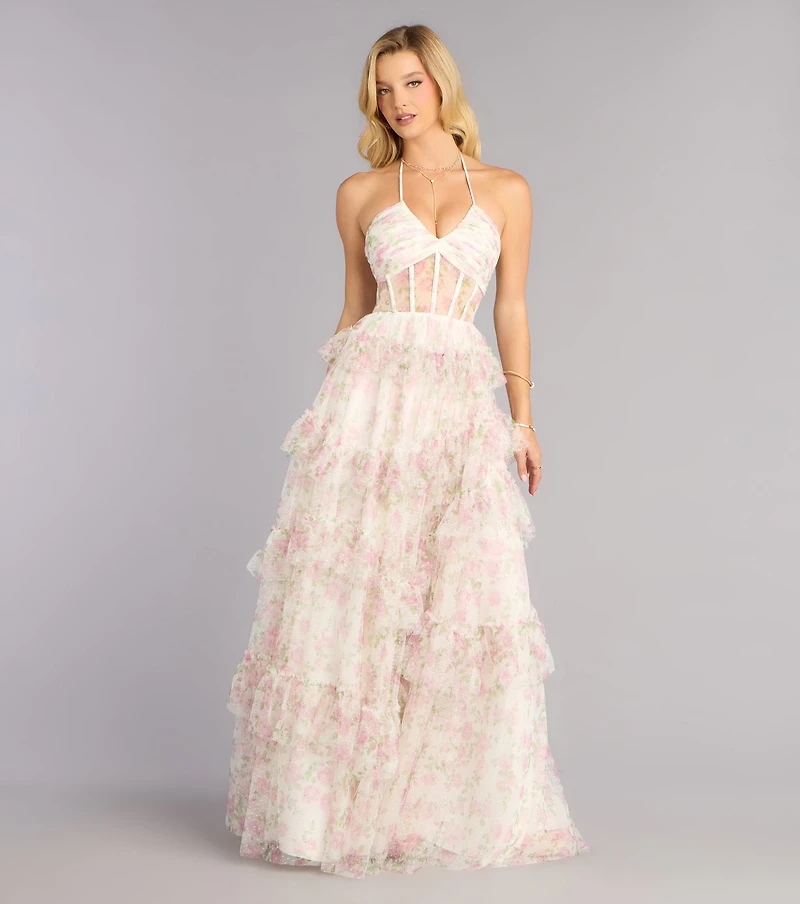 Romantic and effortlessly graceful, the Lynn floral swiss dot mesh gown floats with every step in a softly layered, ruffled A line silhouette. The halter V-neck and structured corset bodice sculpt the waist while the airy tiers create beautiful movement. It’s a dreamy choice for moments that call for something unforgettable.