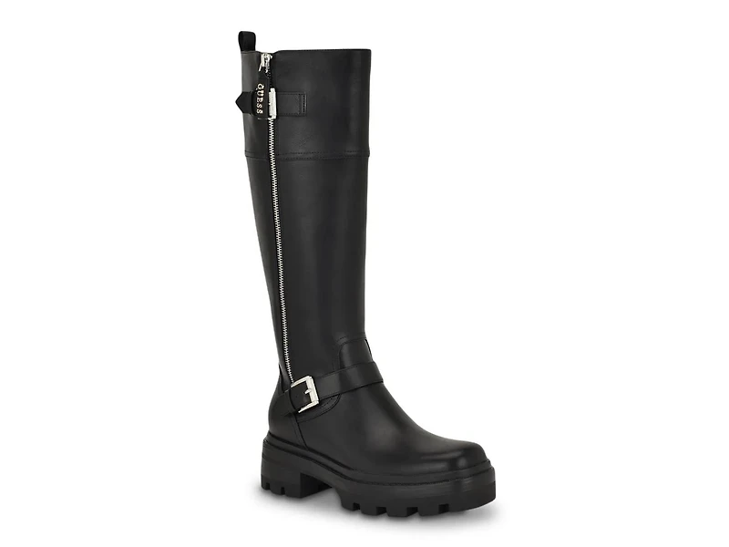 Add a touch of edge to your riding boot collection with the Lynnie boot from Guess. This knee high pair features a decorative outside zipper and buckles with a chunky block heel and lugged sole.