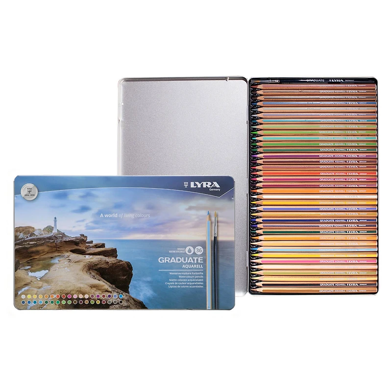 The pencils are super durable. The pack also includes a brush with synthetic bristles which is ideal for spreading the color. Partnering with Canson and Daler-Rowney, the Graduate line contains an affordable range of art supplies fit for artists in the studio or art students in class. Aquarell watercolor pencils can be easily blended and layered to create stunning effects. They are a great option for artists who want to paint on the go. These pencils eliminate the need for carrying multiple brushes and water containers since they can be used directly on paper and then activated with water using a brush. Tackle details confidently with fine lines and control the amount of gradient or wash using a watered brush.Details: Assorted colors 3.3 mm lead size Set of 36 pencils Includes metal box and synthetic brush Easy to sharpen Easily to blend PEFC certified cedarwood Suitable for travel, outdoor sketching and painting sessions outside the studio