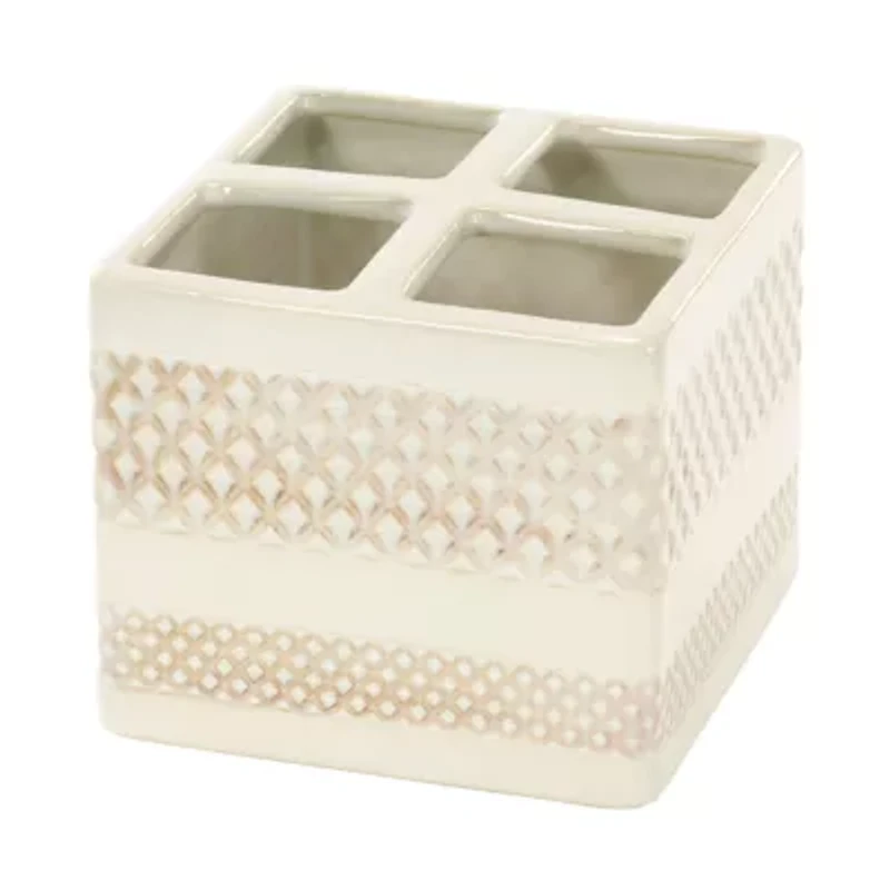 The Nicole Miller Lyra Square Organizer features a glossy solid cream ceramic base with wide and narrow embossed trellis bands. The trellis is highlighted with a hand-applied light brown reactive glaze-each piece is unique. Divided into quarters, it's a great addition to any bathroom, bedroom, kitchen or office where you need a little extra storage. Made of durable ceramic for easy care. Other matching bath accessories available. Elevate your bathroom décor with this effortlessly chic and functional ceramic accessory. Geometric Imported Product Specifications 4.50-in. x 4.50-in. x 3.88-in. Material & Care Ceramic Wipe clean