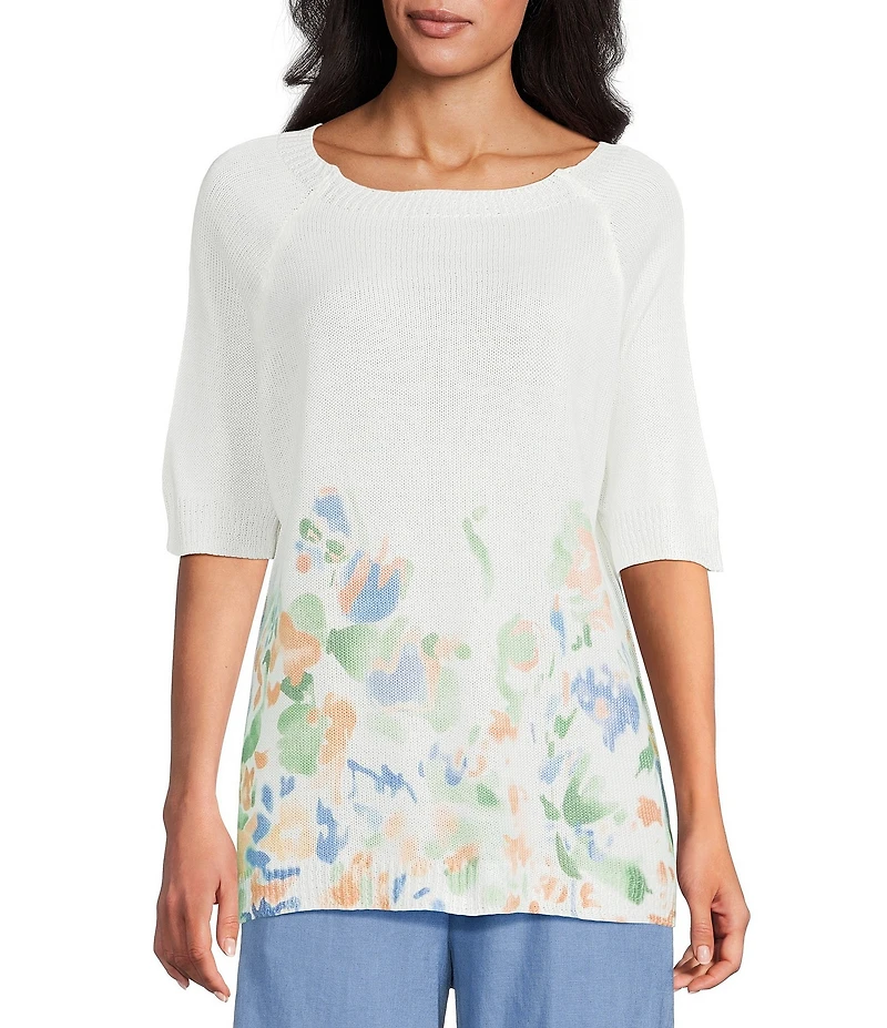M Made In Italy Knit Border Print Crew Neck Raglan Elbow Length Sleeve Top