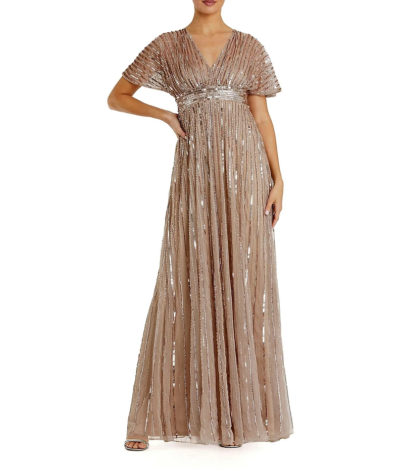 From Mac Duggal, this dress features:  Mesh fabrication  A-line silhouette  V neckline  Short sleeves  Embellished  Zip back closure  Approx. 60" length  Polyester  Dry clean  Imported.