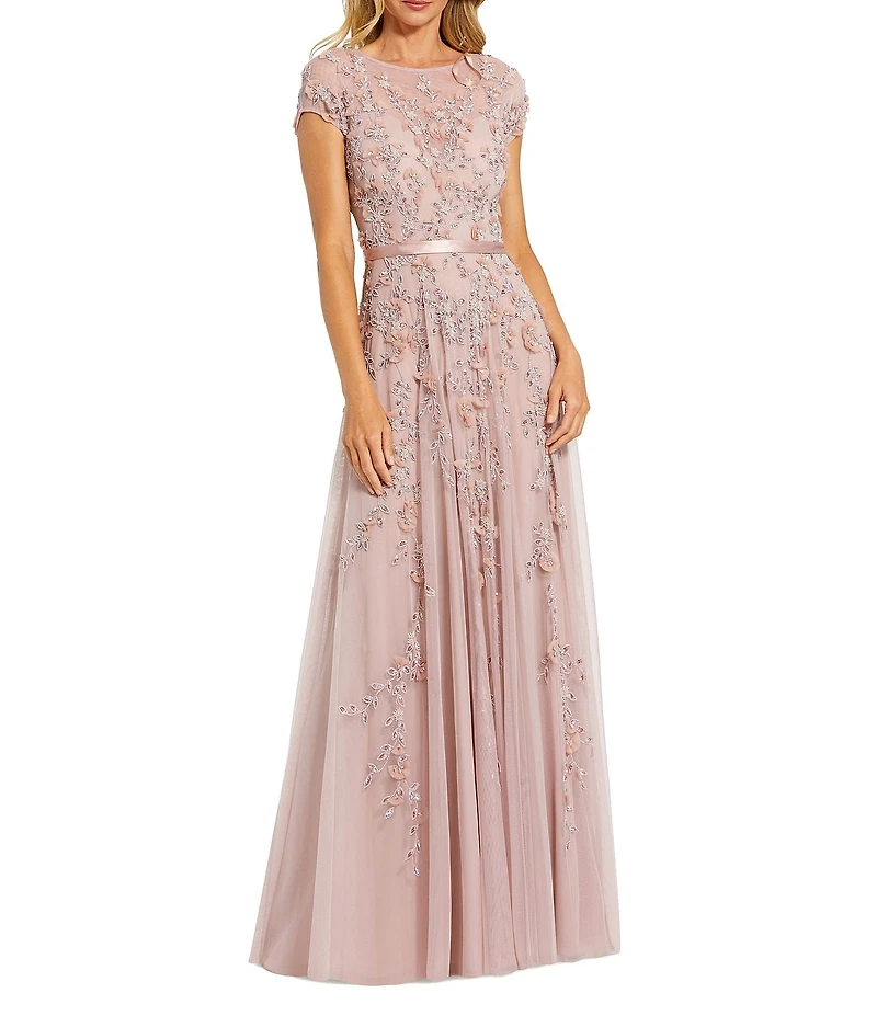 From Mac Duggal, this gown features: Aline silhouette Embellished mesh fabrication 3D Floral motif Illusion round neckline Cap sleeves Satin waist trim Zip back closure Lined Approximate length 60" Polyester Hand wash Imported.