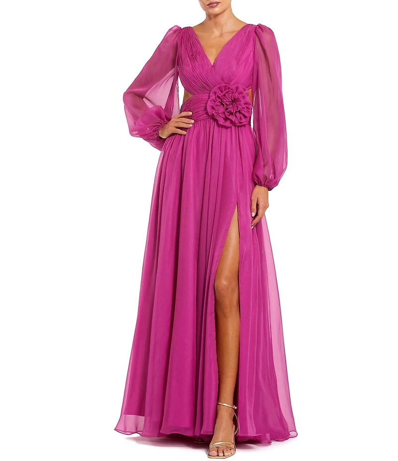 Mac Duggal Long Sleeve V Neck Chiffon Long Gown With 3D Flower Applique