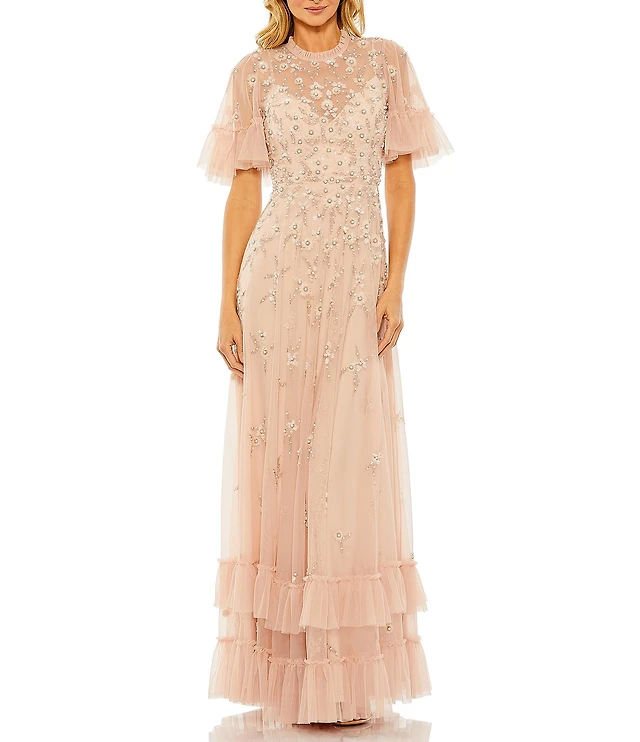 Mac Duggal Ruffled Floral Beaded Illusion Mock Neck Short Flutter Sleeve Gown