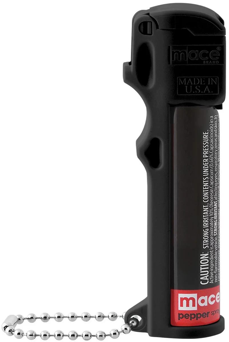Feel safe on the go with the Mace Personal Model Pepper Spray. The spray formula supplies a 12-foot stream of pepper spray and UV dye for protection and assailant identification. The canister delivers up to 20 bursts of spray, while the finger-grip design aids in aim accuracy and the flip top prevents accidental discharge. Made in the USA.