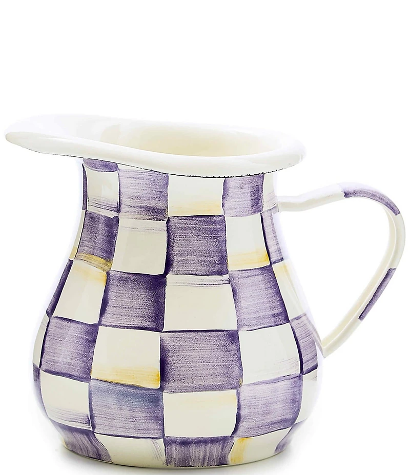 From MacKenzie-Childs, this creamer features: The Check Enamel Creamer is the perfect way to energize your morning cup of joe. Take your coffee black? Don't fret! This versatile enamel vessel invites countless uses, from hot fudge to spaghetti sauce to homemade herb vinaigrette The heavy-gauge steel underbody is glazed with hand-painted, color-dragged checks in a range of hues Approx. 5.75" wide, 4.5" tall, 14 oz. capacity Pieces may vary due to the handmade nature of each product Dishwasher safe; For best results, hand-wash with mild soap and dry immediately Do not microwave Use caution with hot liquids Our enamelware exceeds both federal food safety regulations and California's Proposition 65, the strictest environmental safety standards in the U.S. Handle enamelware with care and discontinue use for food service if it becomes chipped, cracked, or broken Imported.