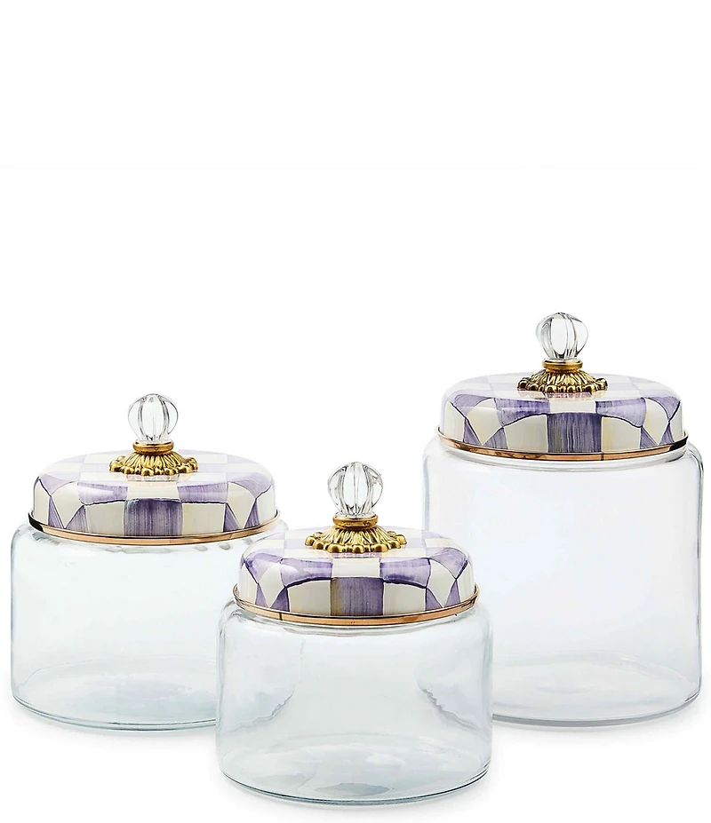 From MacKenzie-Childs, this canister features: Keep countertops tidy in MacKenzie-Childs style with the Check Kitchen Canister Glass canister and heavy-gauge enameled steel lid rimmed in bronzed stainless steel with glass and brass accents Collect all three convenient sizes. (each sold separately) Pieces may vary due to the handmade nature of each product Glass is dishwasher safe Hand-wash enamel lid and dry immediately MacKenzie-Childs enamelware exceeds both federal food safety regulations and California's Proposition 65, the strictest environmental safety standards in the U.S. Handle enamelware with care and discontinue use for food service if it becomes chipped, cracked, or broken Each measures: Small approx. 6.5" dia., 7" tall, 48 oz. capacity Medium approx. 7" dia., 8" tall, 64 oz. capacity Large approx. 7" dia., 9.5" tall, 96 oz. capacity Imported.