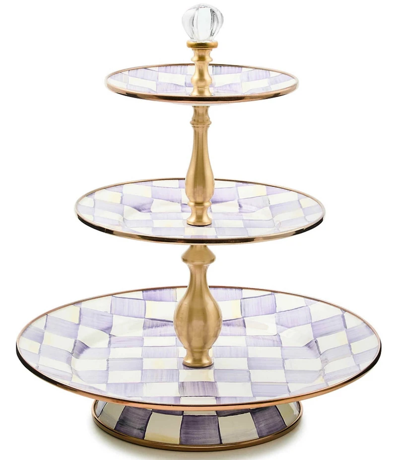 From MacKenzie-Childs, this tiered sweet stand features: Covered in cupcakes for your princess's party, or scones and biscotti for your morning coffee club, the Check® Enamel Three Tier Sweet Stand is sure to stand out Hand-painted, enameled steel, glass with a coordinating knob Heavy-gauge, hand-glazed steel underbody with hand-painted Check®, rimmed in bronzed stainless steel Topped with a glass knob and brass hardware Pieces may vary due to the handmade nature of each product MacKenzie-Childs enamelware exceeds both federal food safety regulations and California's Proposition 65, the strictest environmental safety standards in the U.S. Handle enamelware with care and discontinue use for food service if it becomes chipped, cracked, or broken Approx. measurements: Top tier 7" dia. Middle tier 9" dia. Bottom tier 12" dia. 14" tall Wipe clean with a soft, damp cloth. If needed, hand-wash with mild soap and dry immediately Imported.