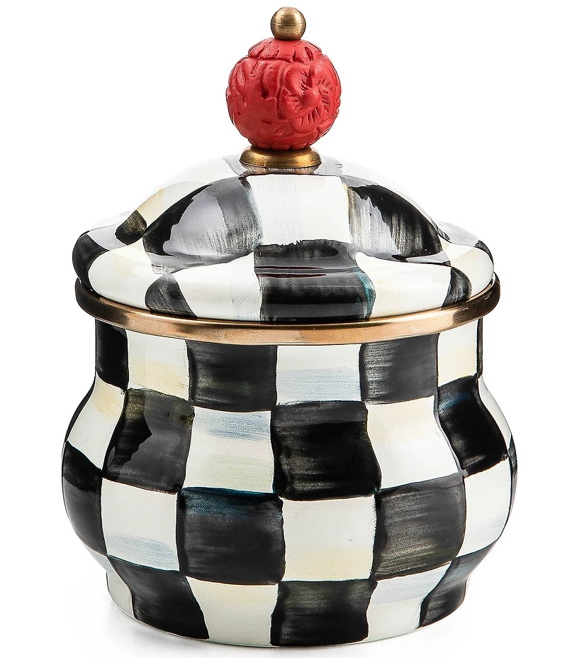 From MacKenzie-Childs, this lidded sugar bowl features: With a subtle jewel-tone palette woven by an artisan's brush through the glossy, hand-painted, high-contrast checks, we've yet to find a color (or food!) that doesn't look good with Courtly Check. Approx. 4" dia., 5.25" tall (with lid), 10 oz. capacity Heavy-gauge, hand-glazed steel underbody with hand-painted Checks, rimmed in bronzed stainless steel Pieces may vary due to the handmade nature of each product Wipe clean with a soft, damp cloth. If needed, hand-wash with mild soap and dry immediately Do not microwave Our enamelware exceeds both federal food safety regulations and California's Proposition 65, the strictest environmental safety standards in the U.S. Handle enamelware with care and discontinue use for food service if it becomes chipped, cracked, or broken Imported.
