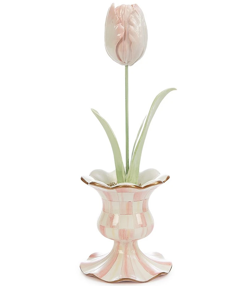 From the Easter Collection by MacKenzie-Childs, the Rosy Garden Tulip in Vase features: This evergreen Rosy Garden Tulip in Vase brings the style year after year. Features a metal tulip in an elegant vase decorated with Rosy Checks and Stripes. Crafted from metal floral with resin vessel Approx. 3.25" dia., 8.75" tall Pieces may vary due to the handmade nature of each product Wipe with a soft, dry cloth Imported.