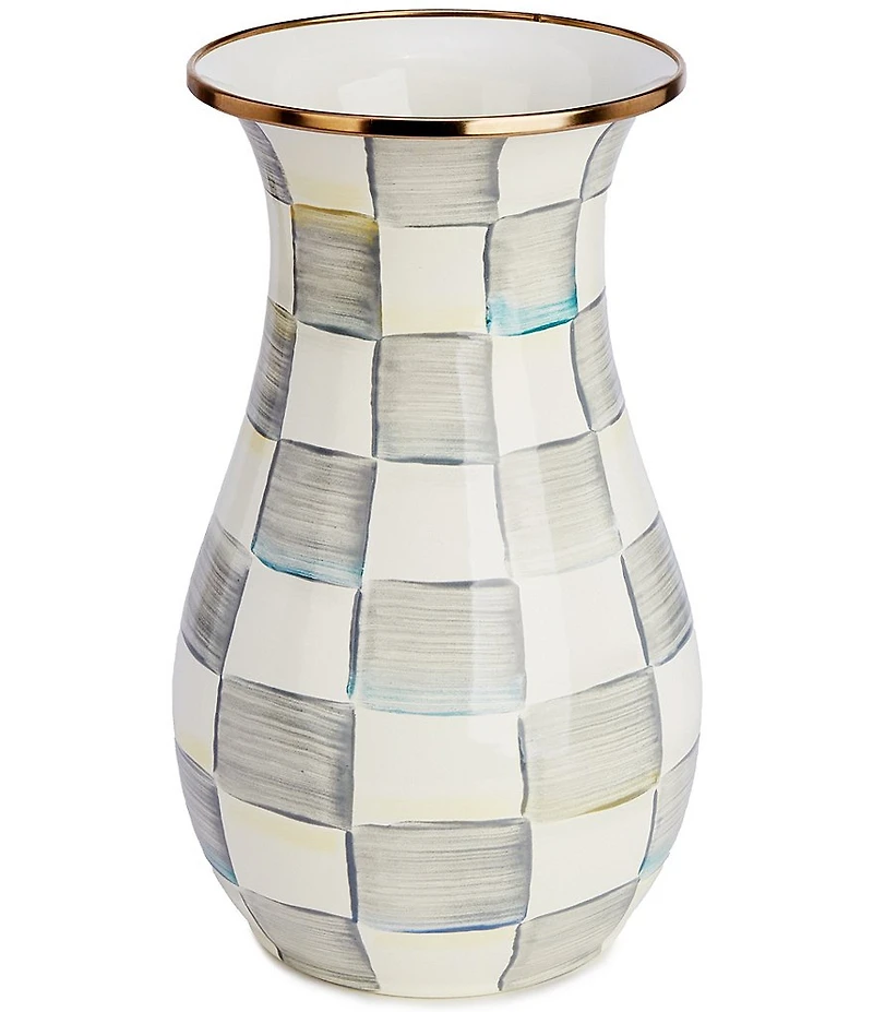 From MacKenzie-Childs, this vase features: Farm-fresh and inspired by traditional glass milk jugs, the Tall Sterling Check® Enamel Vase features hand-painted grey checks on enameled steel with a bronze rim. It's the kind of vase that's just right for a casual wildflower bouquet, cherry-blossom branches, or pussywillow stalks. Approx. 6" dia., 10" tall, 96 oz. capacity Heavy-gauge, hand-glazed steel underbody with hand-painted Sterling Checks®, rimmed in bronzed stainless steel. Pieces may vary due to the handmade nature of each product. Wipe enamel clean with a soft, damp cloth. If needed, hand-wash with mild soap and dry immediately. Imported.