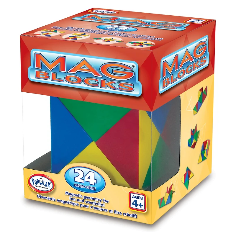 Fun for everyone, Mag Blocks stimulate both imagination and creativity as well as promote basic logical thought. The Mag Blocks cube is made up of 24 large, easy-to-handle, colorful pyramids. Held together by magnets, they fit together only when the magnets are properly aligned. Not immediately apparent (even to adults) your child will first have to understand how the blocks fit together in order to build with Mag Blocks. 20 challenge cards are included with suggested designs to get you started but the real fun begins when you start creating your own!