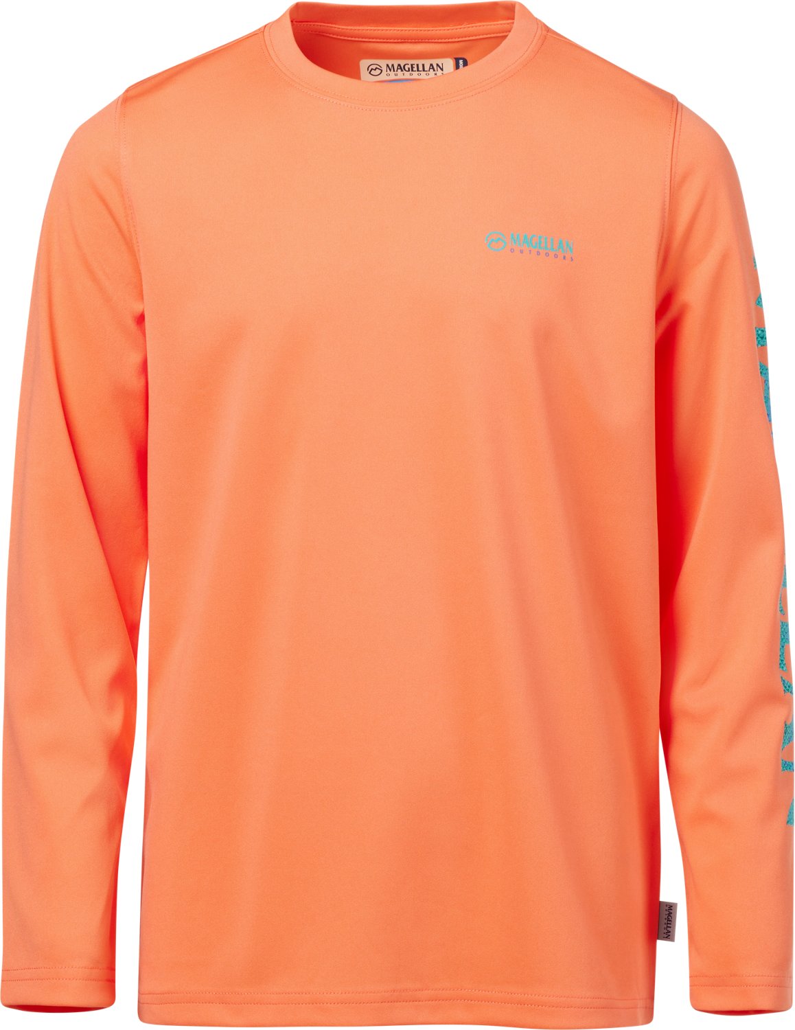 Kick back and wait for the fish to bite in the Magellan Outdoors Boys' Casting Crew Print Logo Fishing T-shirt The UPF 50+ protection helps keep your skin safe in the sun, and the 100% recycled polyester construction withstands wear and tear while feeling soft. A crewman logo print highlights a sleek appearance, and the moisture-wicking technology helps you stay cool and dry out on the water.