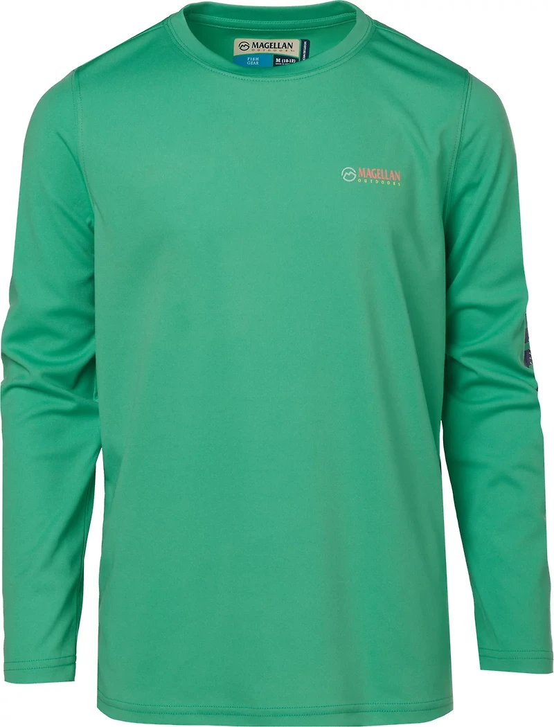 Kick back and wait for the fish to bite in the Magellan Outdoors Boys' Casting Crew Print Logo Fishing T-shirt The UPF 50+ protection helps keep your skin safe in the sun, and the 100% recycled polyester construction withstands wear and tear while feeling soft. A crewman logo print highlights a sleek appearance, and the moisture-wicking technology helps you stay cool and dry out on the water.