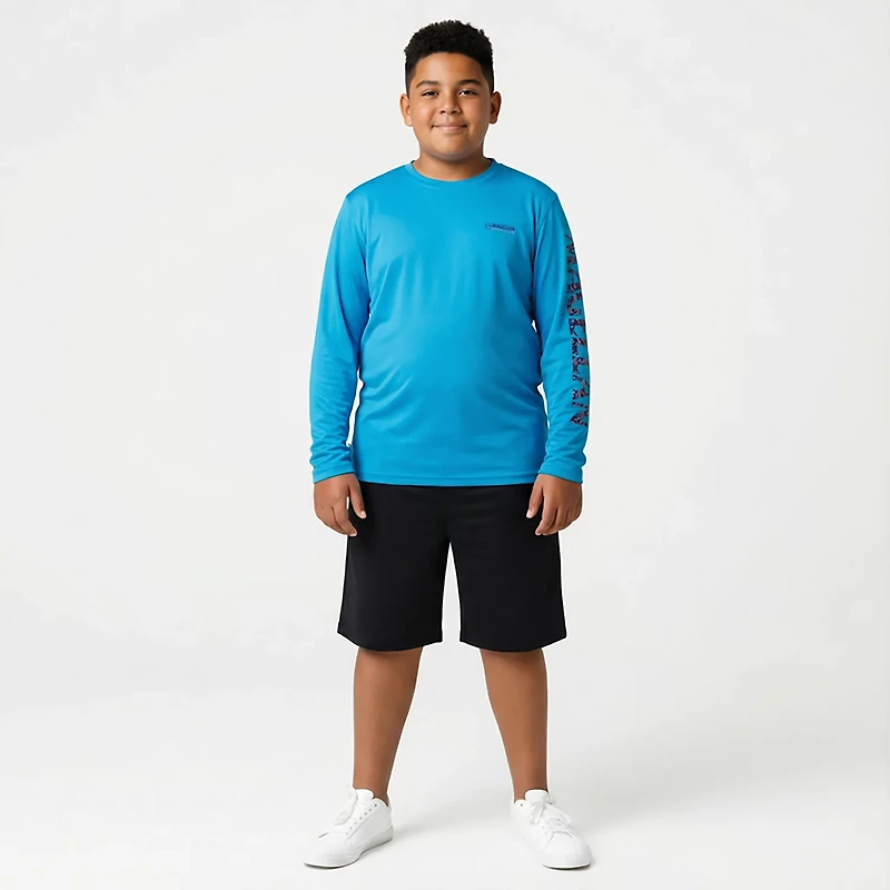 Kick back and wait for the fish to bite in the Magellan Outdoors Boys' Casting Crew Print Logo Fishing T-shirt The UPF 50+ protection helps keep your skin safe in the sun, and the 100% recycled polyester construction withstands wear and tear while feeling soft. A crewman logo print highlights a sleek appearance, and the moisture-wicking technology helps you stay cool and dry out on the water.