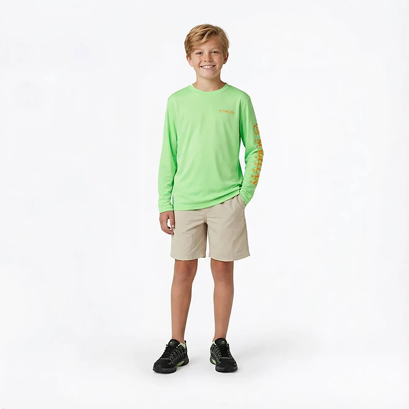 He can head to the water wearing the Magellan Outdoors Boys' FishGear Casting Crew Fish Print Long Sleeve T-shirt. This T-shirt is made from recycled polyester interlock for lightweight comfort. The UPF protectant guards against harmful sun rays, while the fish print adds style.