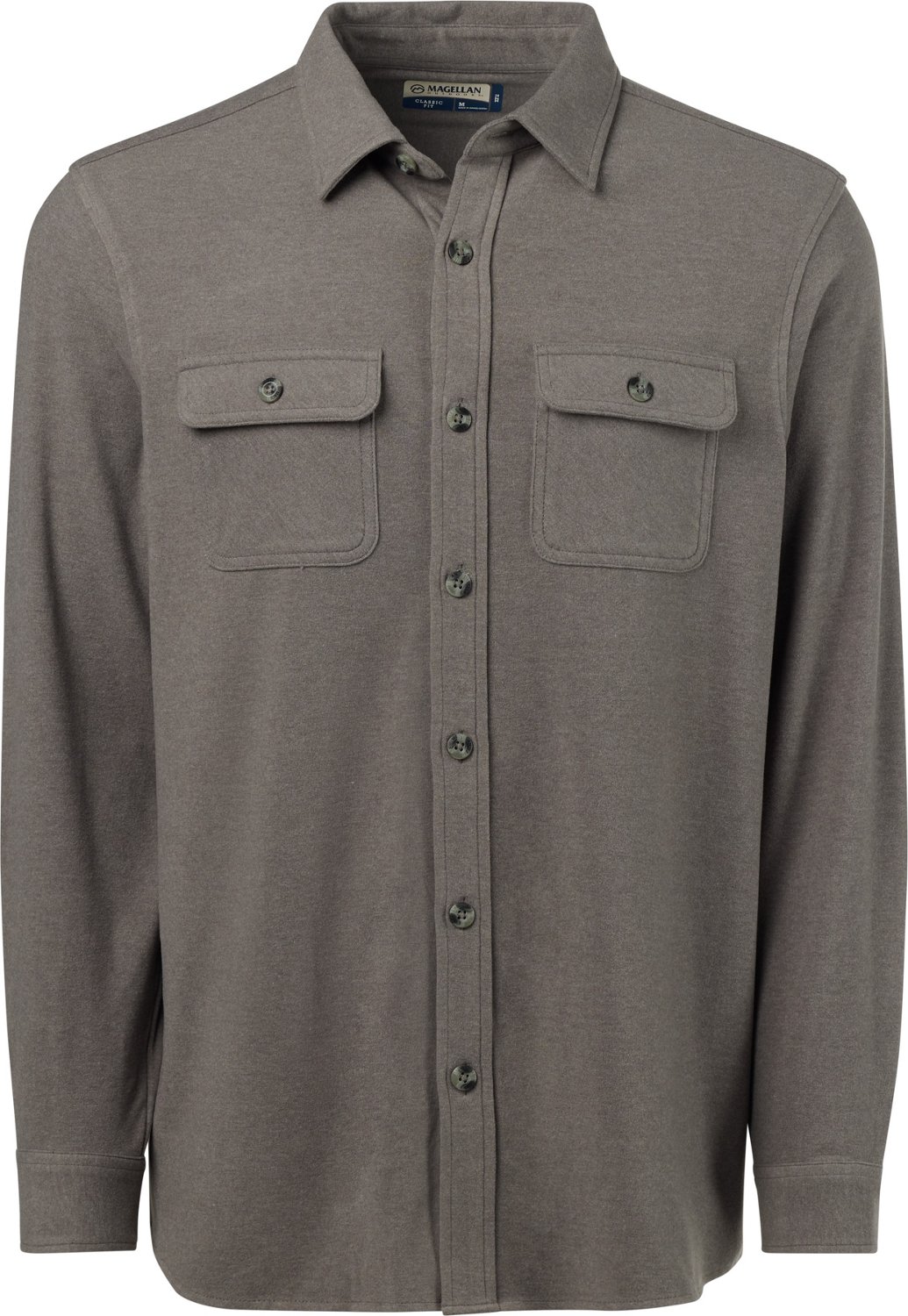 Put on the Magellan Outdoors Men's Campfire Long Sleeve Shacket and stay cozy out in nature. This shirt jac is made of 62% polyester, 33% rayon and 5% spandex brushed jersey and features Flex Technology to stretch as you bend and move, and its 2 pockets help you keep snacks, electronics and more with you.