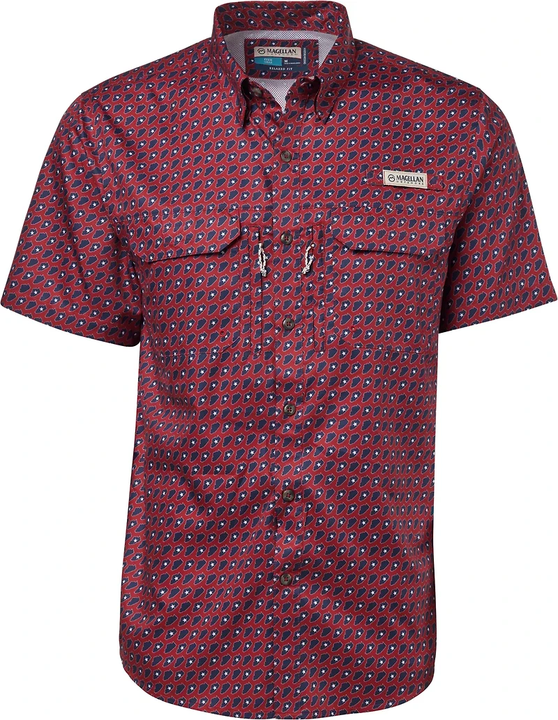 Show off your local roots with the Magellan Outdoors Men's Illinois Local State Print Shirt. This lightweight polyester shirt with integrated UPF technology wicks away sweat and has a mesh liner to help you stay cool, dry and comfortable all day while protecting your skin from UV rays. This button-down shirt is easy to take off after a long day and features an Illinois-inspired print to add style.
