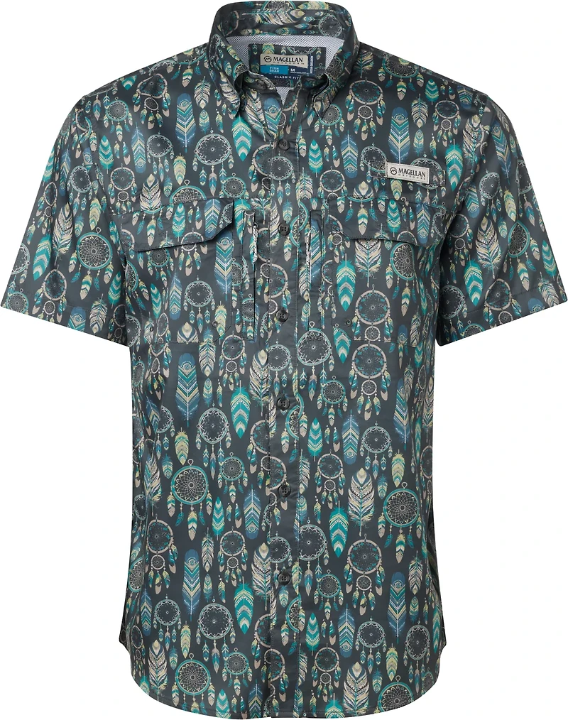 Show everyone where you're from with the Magellan Outdoors Men's Oklahoma Local State Print Shirt. This button-down shirt is made of polyester twill with moisture-wicking technology for a dry, comfortable feel. The graphic design highlights your southern roots. UPF 30 sun protection. Short sleeves.