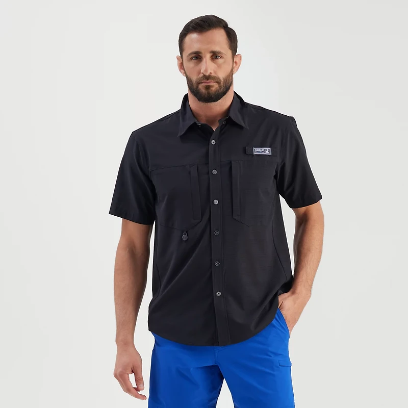 Stay cool during long fishing days with the Magellan Outdoors Men's Pro Jacob Wheeler Angler Short Sleeve Shirt. This button-down shirt is made of a lightweight blend of polyester and spandex for comfortable stretch. The moisture-wicking, quick-drying fabric utilizes cooling technology to help you stay cool and dry all day, while the antimicrobial properties help shield against odor, keeping you fresh.