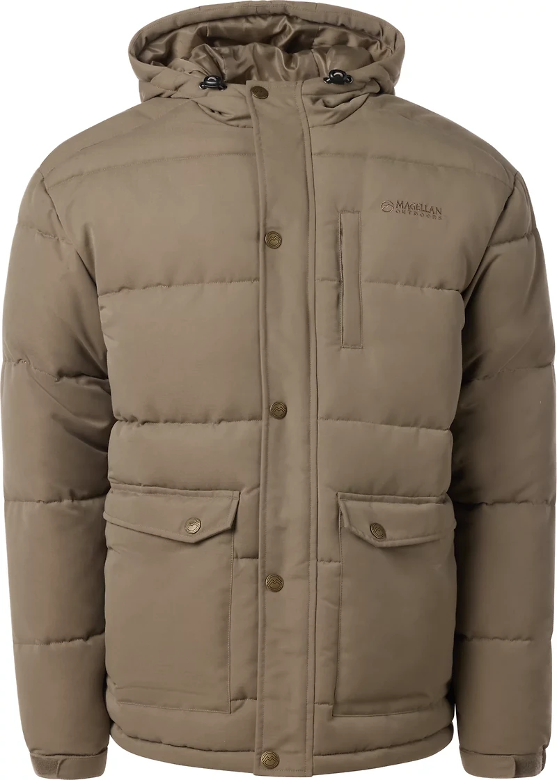 For those who want to brave the cold, look to the Magellan Outdoors Men's Richland Falls Utility Puffer Jacket. This puffer jacket is made of 100% polyester spun fabric with polyester taffeta lining to help wearers stay comfortable and features 700-750 fill power faux down insulation to help hold in warmth.