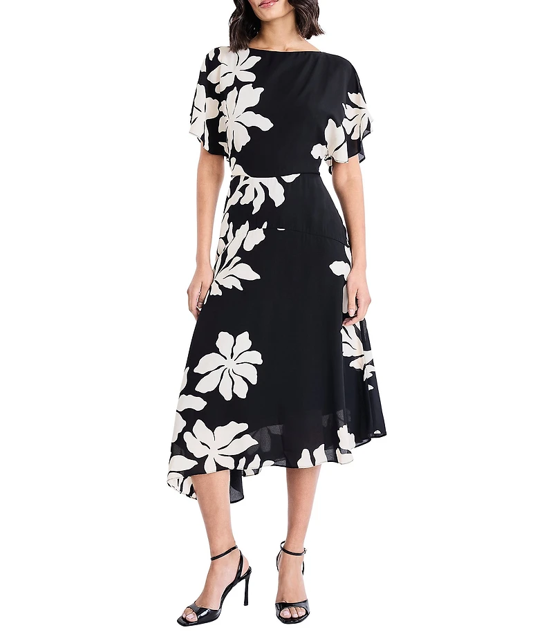 Maggy London Floral Print Georgette Boat Neck Ruffle Sleeve Asymmetrical A-Line Midi Dress