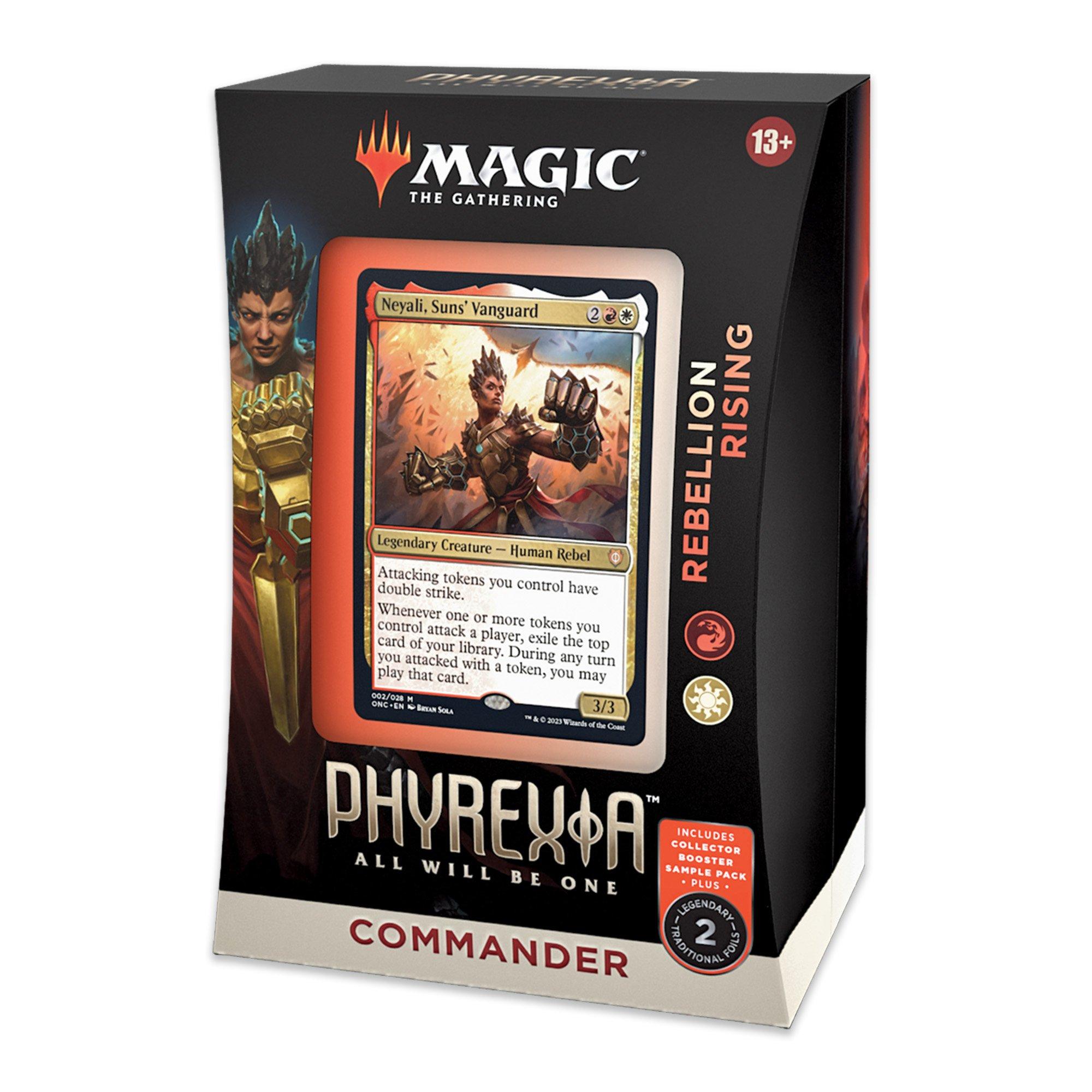 Complete your collection with the finest cards the Phyrexians have at their command. Each booster contains borderless cards, showcase cards, gorgeous foils, and a card with a special treatment that celebrates the glory of Phyrexia. The Corrupting Influence Phyrexia: All Will Be One Commander Deck Contains:  1 ready-to-play White-Black-Green deck of 100 Magic cards (2 Traditional Foil Legendary cards, 98 nonfoil cards) 2-card Collector Booster Sample Pack (contains 1 Traditional Foil or nonfoil alternate-border card of rarity Rare or higher and 1 Traditional Foil Showcase Ichor Common or Uncommon card) 1 foil-etched Display Commander (a thick cardstock copy of the commander card with foil etched into the card’s border and art) 10 double-sided tokens 1 deck box (can hold 100 sleeved cards) 1 Life Wheel 1 strategy insert 1 reference card