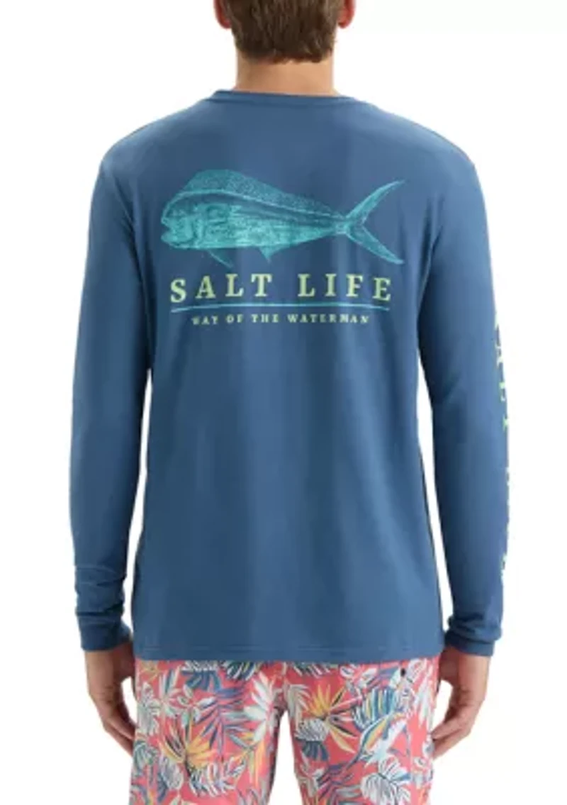 The Salt Life Mahi Way Long Sleeve Tee offers a classic crew neck, cuffed sleeves, and a regular fit for comfortable all-day wear. Crafted from a soft blend, this piece features a chest patch pocket, Salt Life logos on the chest and sleeve, and a bold Mahi Way graphic on the back. It's built for everyday style with a touch of coastal spirit. Left Chest Patch Pocket Left Chest and Right Sleeve Screen-Printed Salt Life Logo Back Screen-Printed Mahi Way Design Regular Fit Machine Wash in Cold Water, Tumble Dry on Low Heat, Do not Dry Clean or Iron Imported Material & Care Cotton, polyester blend Machine washable